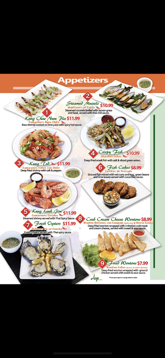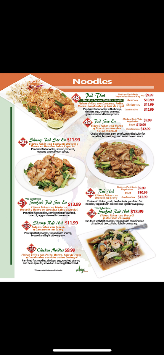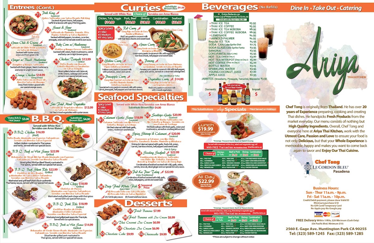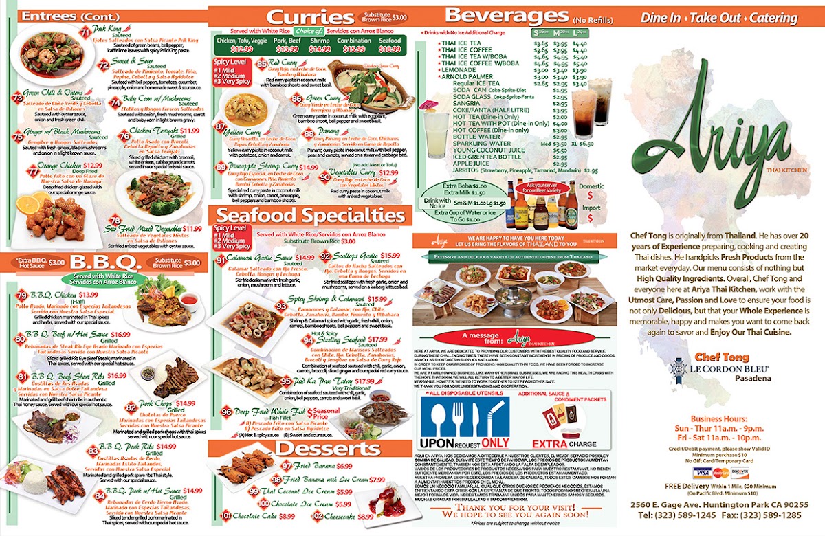 If you're craving authentic Thai flavors, the Ariya Thai Kitchen Menu is sure to delight. Nestled in the heart of Huntington Park, this menu offers a vibrant selection of dishes that showcase the bold, aromatic ingredients of Thai cuisine. From spicy curries to savory stir-fries, each dish is prepared with a perfect balance of sweet, sour, salty, and spicy flavors. Whether you're in the mood for a classic Pad Thai, a comforting bowl of Tom Yum soup, or something adventurous like the Pad Kee Mao, there’s something to satisfy every taste. With fresh, quality ingredients and traditional cooking methods, every bite promises an unforgettable experience. So, dive into the menu and discover your new favorite Thai dish at Ariya Thai Kitchen!